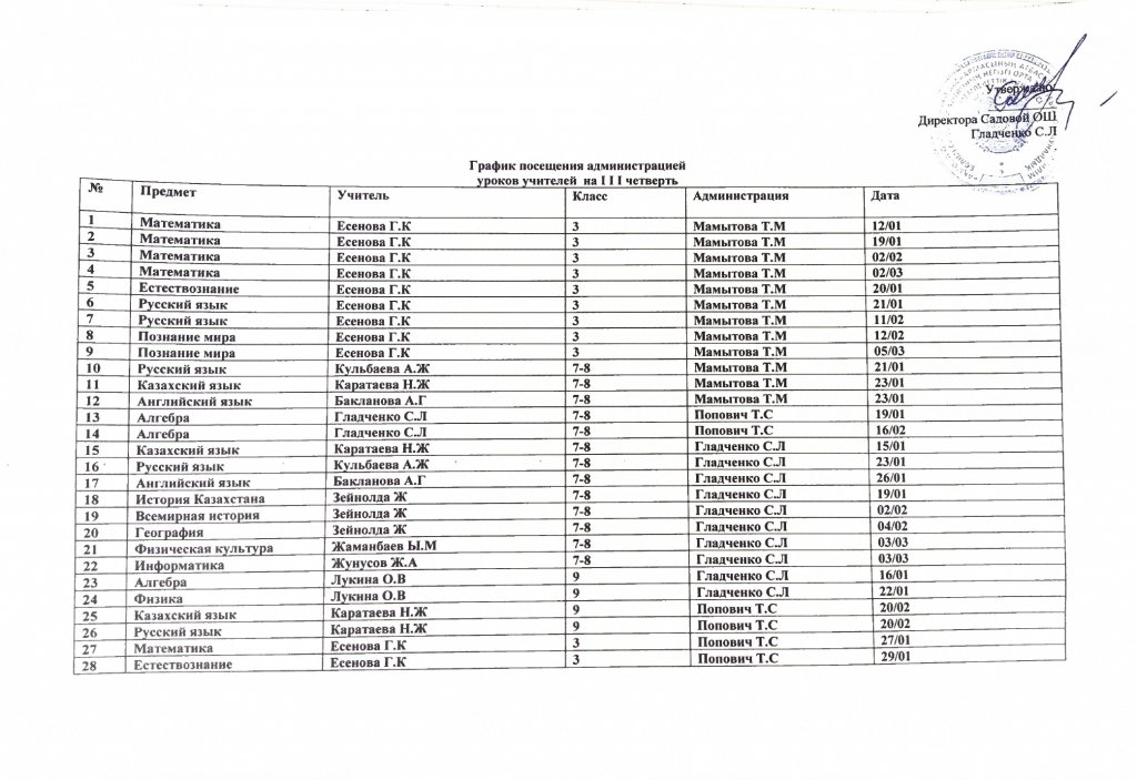 Әкімшілік тарапынан сабақтарға қатысу кестесі (3-тоқсан)