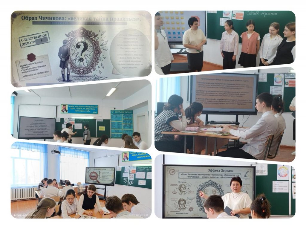 Сабақ барысында оқушылар Чичиковтың бейнесін талдап, оның мінез-құлқын және адамдарға жағымды әсер қалдыру шеберлігін ашып көрсетті. Мұғалім топтық жұмыс, пікірталас, мәтінді талдау сияқты түрлі әдіс-тәсілдерді қолданды. Тоғызыншы сынып оқушылары талқылауға белсенді қатысып, өз ойларын дәлелдеп, қорытынды жасай білді.